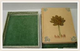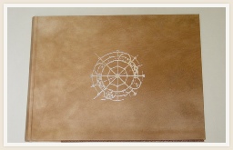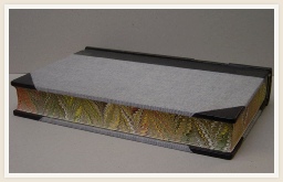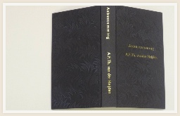 Boek met dubbele band voorzien van kunstpapier. Rug in leer en titel bedrukt in goudfolie.