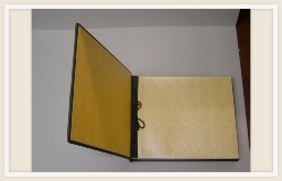 Uitvoering: boekblok losse vellen met buschroeven, band in heel linnen.