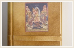 Boek voorzien van een band in perkament, met doorlopende perkamenten strookjes dienend als sluiters en platje van bijbelse voorstelling ingeplakt.