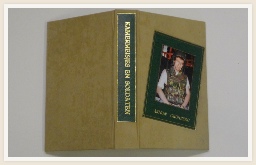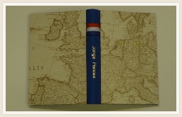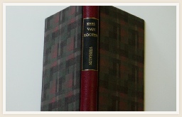 Boek voorzien van een band met opgelegde platten bekleding in stof.