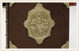 Boek voorzien van een band in leer met zilveren beslag met bijbelse voorstellingen, en langs de ribben bedrukt met goud folie.